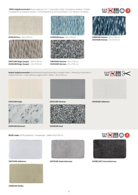 2470110 Ecru L 60 x P 90 cm 24700100 Aqua L 60 x P 90 cm 23869100 Sininen L 60 x P 90 cm