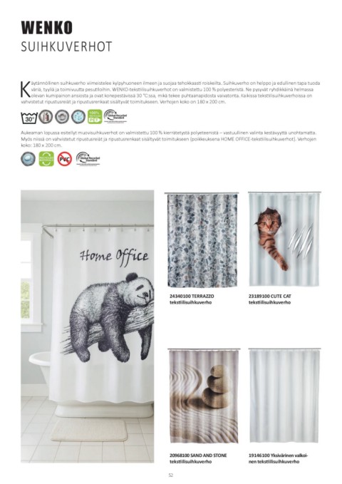 väriä, tyyliä ja toimivuutta pesutiloihin. WENKO-tekstiilisuihkuverhot on valmistettu 100 % polyesteristä. Ne pysyvät ryhdikkäinä helmassa