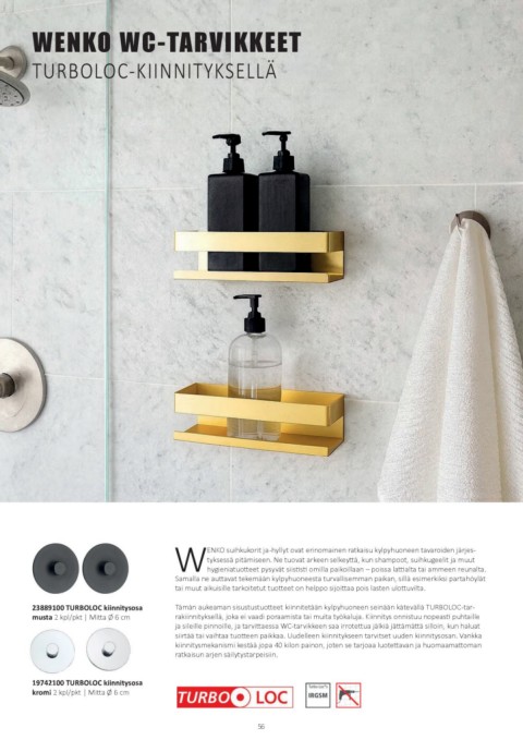 Tämän aukeaman sisustustuotteet kiinnitetään kylpyhuoneen seinään kätevällä TURBOLOC-tar-