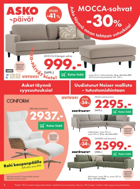 2 *Kaikki -10% ei koske Huippuetutuotteita, shokkihintaisia tarjouksia, Rowico, VM Carpet, Conform eikä loppuunmyyntituotteita.