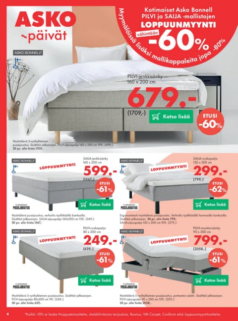 4 *Kaikki -10% ei koske Huippuetutuotteita, shokkihintaisia tarjouksia, Rowico, VM Carpet, Conform eikä loppuunmyyntituotteita.