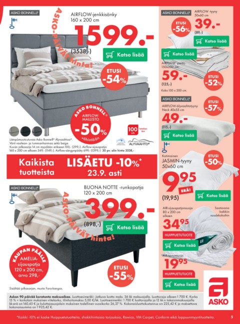 160 x 200 cm alkaen 549,- (1149,-). Airflow-sängynpääty 699,- (1399,-) 30 pv. alin hinta 3538,-