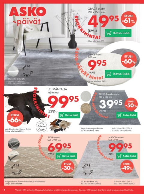 6 *Kaikki -10% ei koske Huippuetutuotteita, shokkihintaisia tarjouksia, Rowico, VM Carpet, Conform eikä loppuunmyyntituotteita.