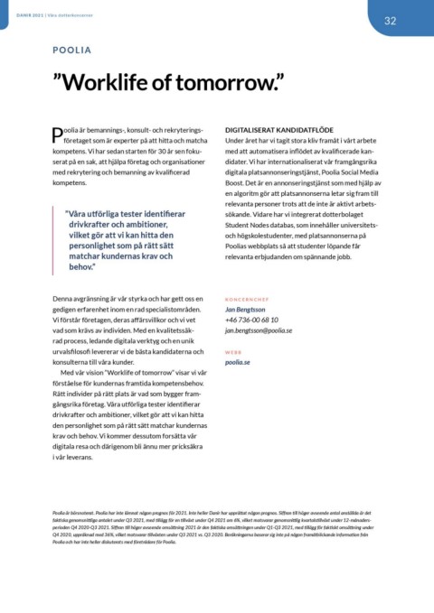Poolia är börsnoterat. Poolia har inte lämnat någon prognos för 2021. Inte heller Danir har upprättat någon prognos. Siffran till höger avseende antal anställda är det