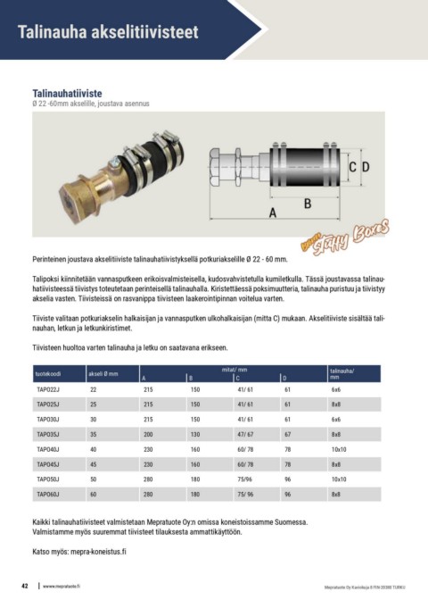 Tiiviste valitaan potkuriakselin halkaisijan ja vannasputken ulkohalkaisijan (mitta C) mukaan. Akselitiiviste sisältää tali-