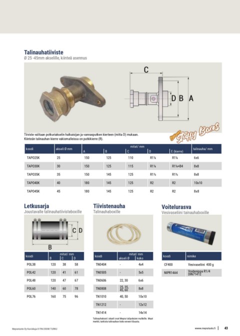 Tiiviste valitaan potkuriakselin halkaisijan ja vannasputken kierteen (mitta D) mukaan.