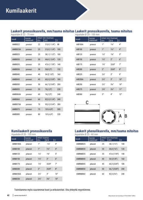 Kumilaakerit pronssikuorella Laakerit phenolikuorella, mm/tuuma mitoitus