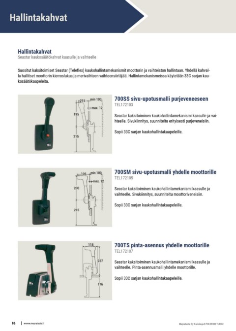 Suositut kaksitoimiset Seastar (Teleflex) kaukohallintamekanismit moottorin ja vaihteiston hallintaan. Yhdellä kahval-