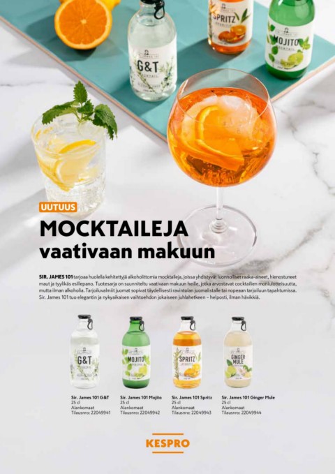 mutta ilman alkoholia. Tarjoiluvalmiit juomat sopivat täydellisesti ravintolan juomalistalle tai nopeaan tarjoiluun tapahtumissa.