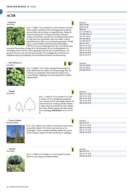 Zon 1-5. Höjd 7-10 m, bredd 6-8 m. Naverlönnen utvecklas Utr 150-200 Co