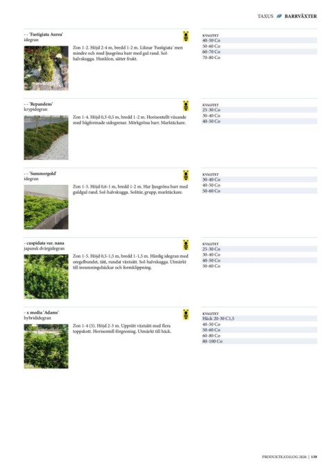 Zon 1-5. Höjd 0,6-1 m, bredd 1-2 m. Har ljusgröna barr med 40-50 Co