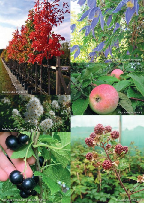 Quercus rubra fk Bäcklösa E Clematis (Atragene-Gruppen) ’Blue Tapers’ E Sorbaria grandiflora ’Maia’ E Malus domestica ’Aroma’ E Ribes nigrum BALSGÅRD PETTER E (BRi 9508-3A) Rubus (Björnbär) ’Loch Tay’ E
