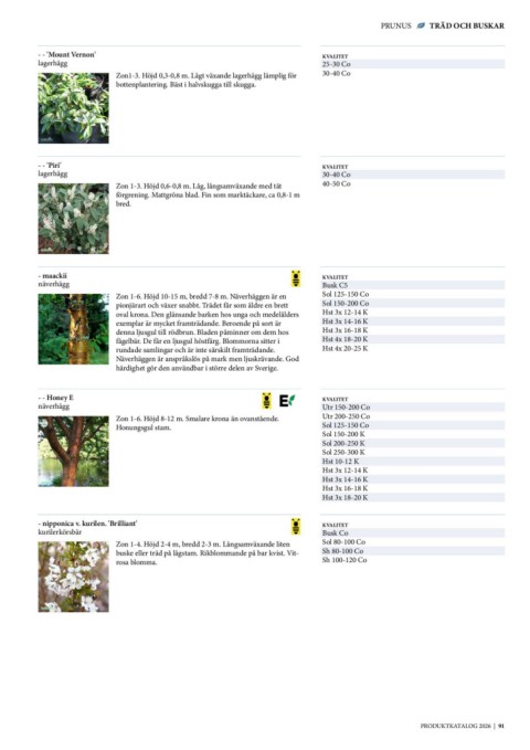Zon 1-4. Höjd 2-4 m, bredd 2-3 m. Långsamväxande liten Hst 3x 12-14 K