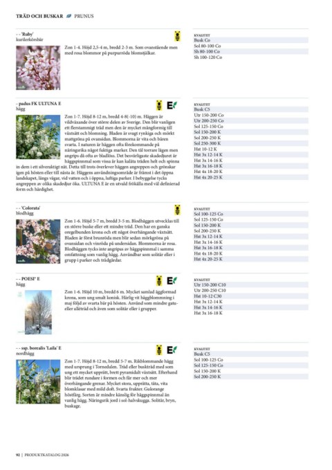 Zon 1-7. Höjd 8-12 m, bredd 5-7 m. Rikblommande hägg Sol 100-125 Co